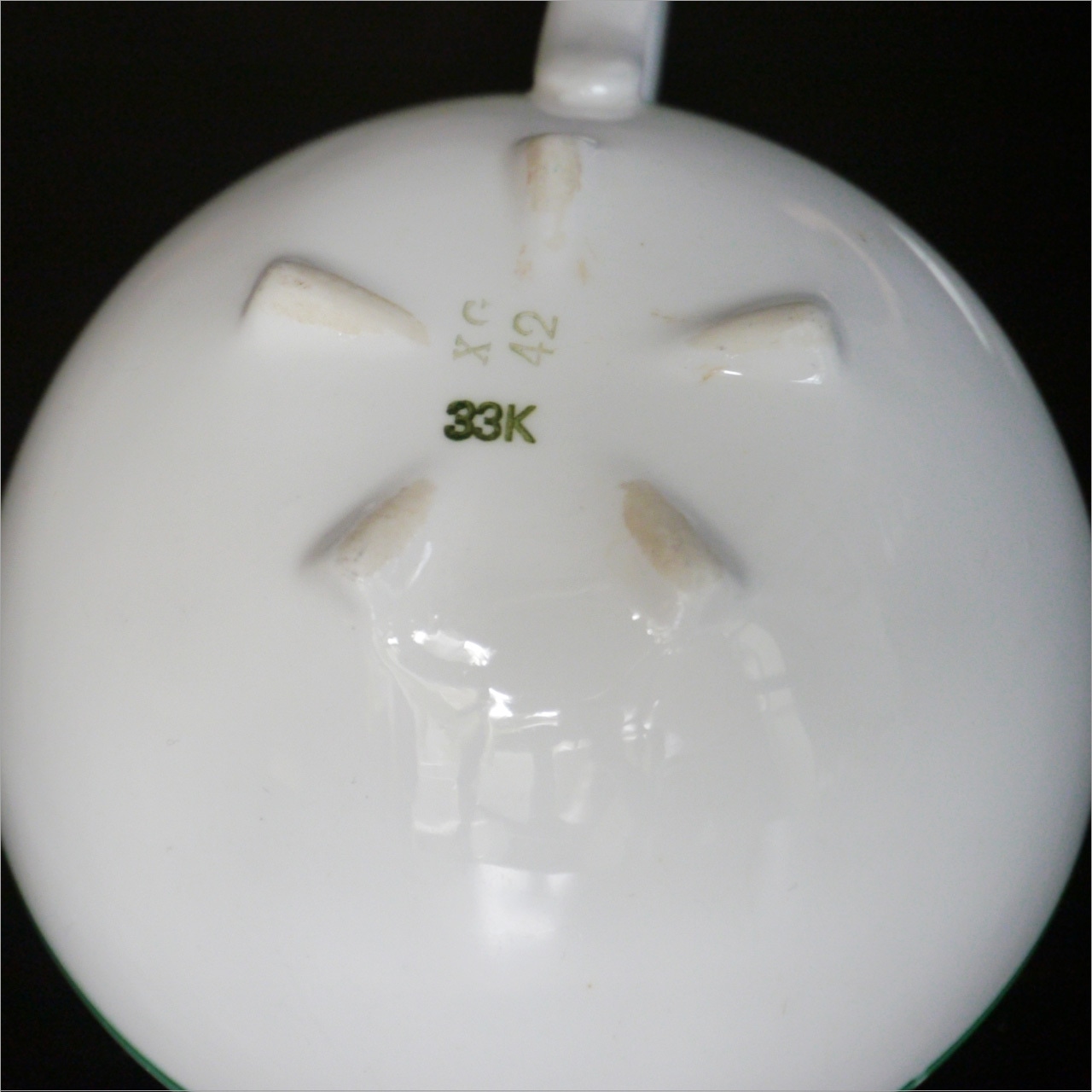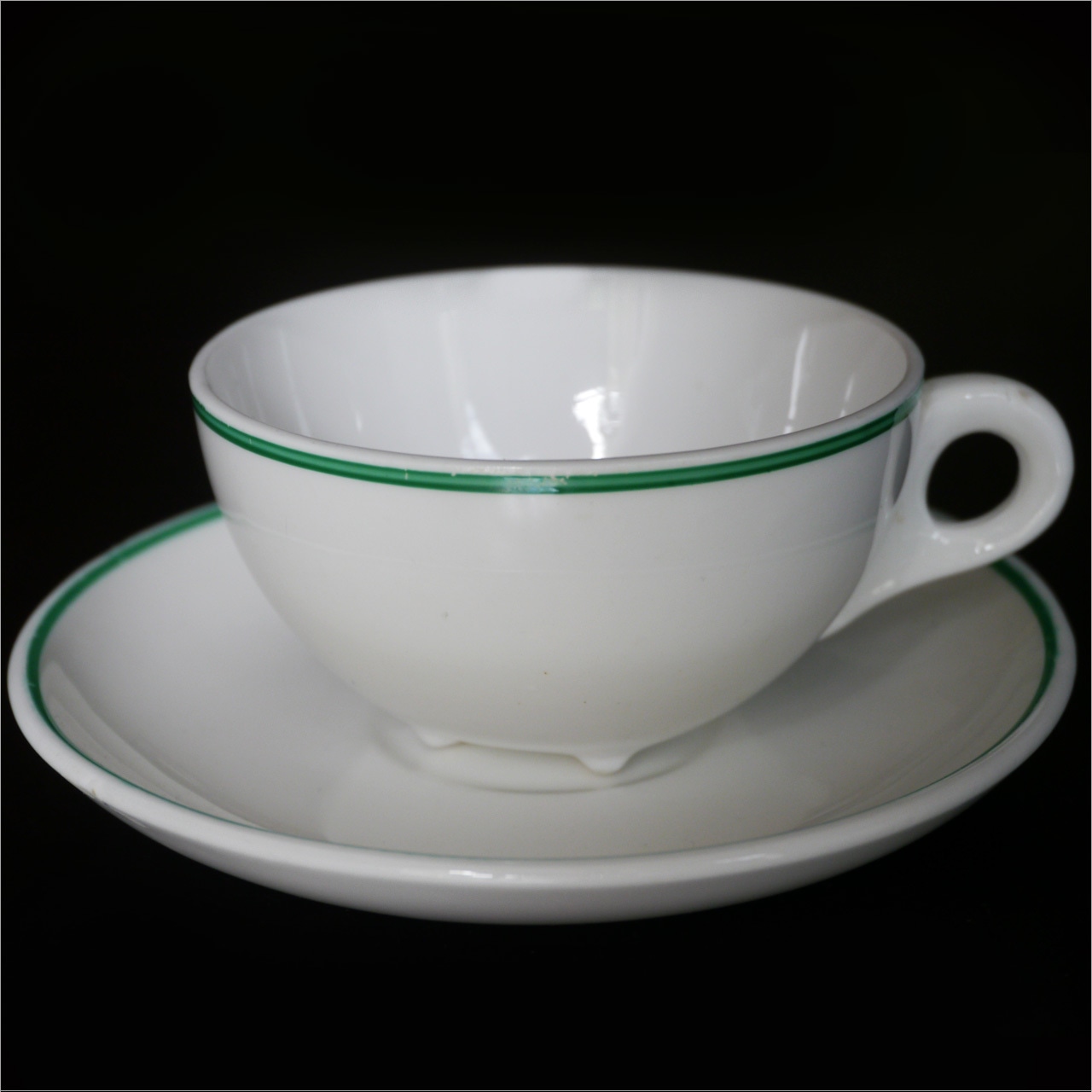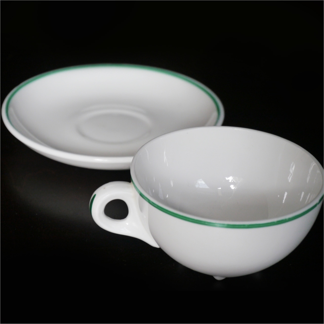 ボーンチャイナ(BENPORALIN )と呼ばれ、白磁器とは異なり牛の骨粉を混ぜた陶土を使ったカップセットです。乳白色でなめらかな質感に緑のラインの絵付けは暖かみを感じさせます。カップの底部分の高台おしゃれです。