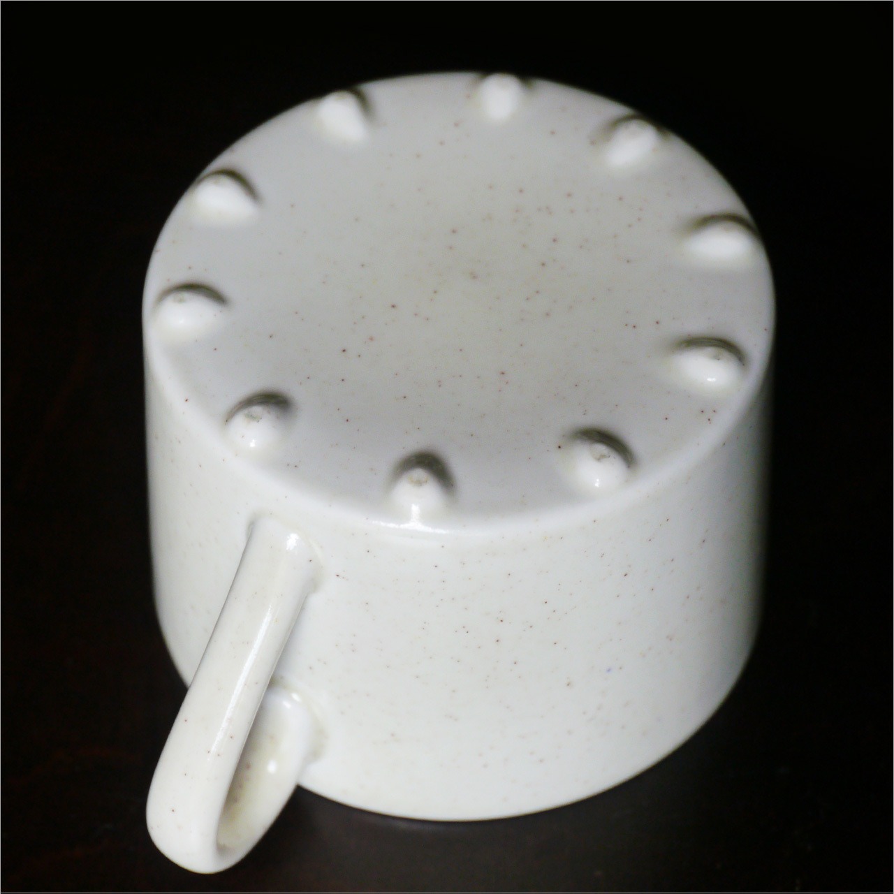 全体に斑点が入った白地としっかりしたフォルムはスティグ・リンドベリのダートのシリーズを思わせます。カップ底の高台が特徴的ですね。